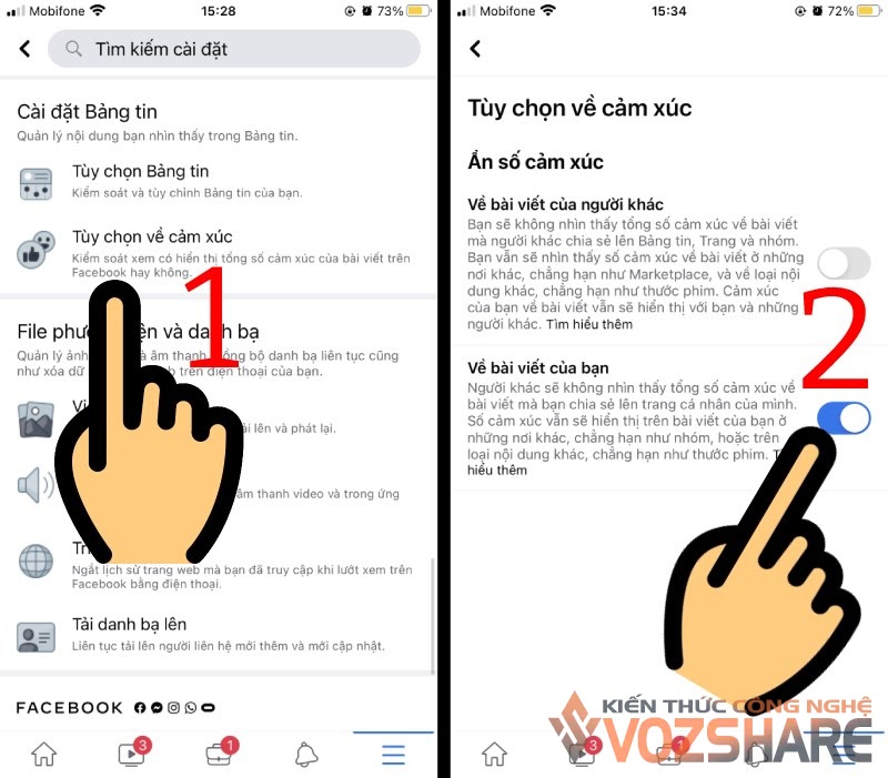 Bước 2: Tại giao diện Cài đặt, lướt xuống chọn mục Tuỳ chọn về cảm xúc > Gạt thanh trượt sang phải tại mục Về bài viết của bạn để ẩn số lượt like bài đăng Facebook của bạn. Nếu không muốn xem số like bài viết người khác thì bạn chọn phần Về bài viết của người khác nhé.